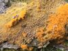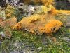 Man pēkšņi radās ideja - vai tur bija nu ļoti mitrs mikroklimats, egle ar melnalksni? Hipotētiski tādas dzeltenas var būt Diachea muscorum. Te bilde ir mazliet līdzīga: https://fr.wikipedia.org/wiki/Fichier:Craterium_muscorum,_Trawscoed,_North_Wales,_Aug_2016_-_Flickr_-_janetgraham84.jpg