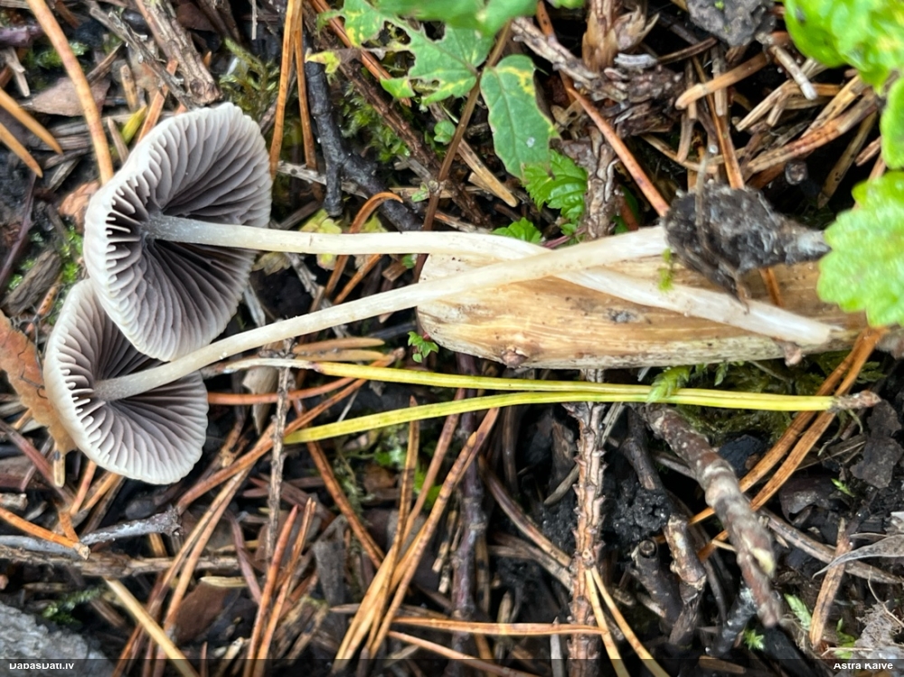 Ļoti neparasta kombinācija - īsa melna kājiņa un apaļīgi plakana galviņa. Un uz nobirām. Gļotsēņu atslēga kā cerīgāko piedāvā nabas jāņodzīti, bet tai neredzu "nabiņu" un nobirām arī nav raksturīga. Šķirstot noteicēju, visas līdzīgās atduras pret pēcsniedzītēm, kas gluži nevarētu būt :D Olītēm melnas kājiņas nav tipiskas (ja tiešām melna), tad paliek lampītes. Par garkājas lampīti (kā blakus) vismaz pagaidām šo nosaukt grūti ;) Atliek cerēt, ka nobriedīs tiktāl, lai mistēriju izdotos atrisināt :)