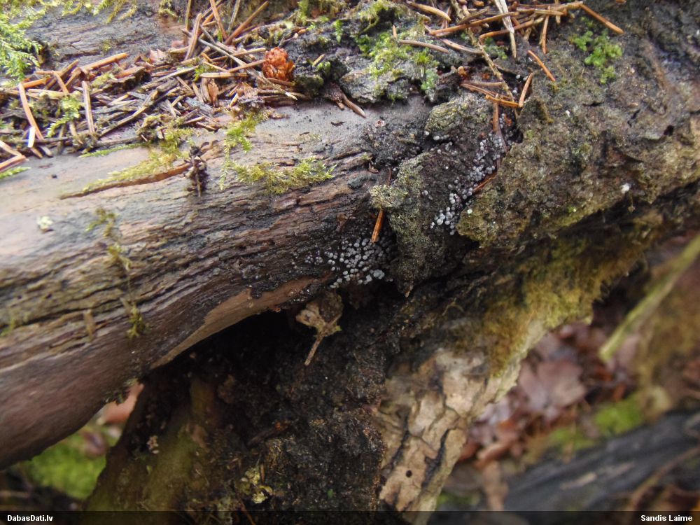 Mazie dzīves prieciņi! :) Lūk, pie kā noved cilvēku iedvesmošana uz gļotsēņošanu, nepieciešamas tikai pareizi iestatītas un sugu redzošas acis. Paraugs tika ķidāts ar pietāti, vēl ir pietiekami daudz materiāla. Atrašanai noteikti jāizmanto 40x lupa ar gaismiņu, bez tās neiztikt. Konkrētā sveķainā egle atšķīrās no visām pārējām, bija noliekusies 45 grādu lenķī, pasargāta no tiešiem nokrišņiem. Īpaša uzmanība jāvelta samtaini melnajam micēlijam, ar ko noklātas senas sveķainas rētas. Ja tiek ieraudzīti gļotsēnes augļķermeņi, tad viss uzreiz kļūst skaidrs. Tie ir pietiekami izteiksmīgi. Novēlu veiksmes visiem, kuri vēlas šo būtni ieraudzīt savām acīm! Vakar pārskatīju arī citas DMB audzes, tomēr bez sekmēm. Tomēr prasības pret dzīvotni nav gluži izšķirošas, Dānijā atrasta arī stādītās mono-audzēs. Jāturpina meklēt retās sugas :)
