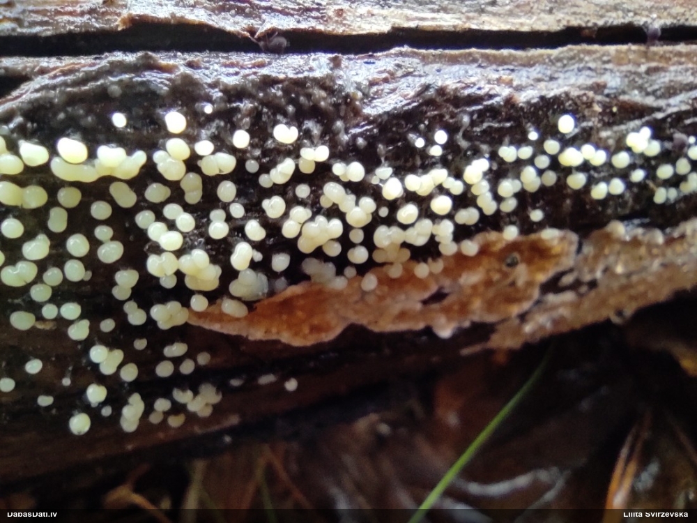 Paldies par paraugu! Paraugā augļķermeņi gan bija ļoti cieti, līdz galam nenobrieduši. Jauna eksemplāra krāsa var būt nozīmīga noteikšanā, bet svarīgi arī nobriedināt (turot mitrākā vietā), citādi perīdiju noņemt mikroskopēšanai ir praktiski neiespējami. Šajā gadījumā mazu gabaliņu izdevās atmiekšķēt un nodabūt, kas sarežģītākos gadījumos varētu būt nepietiekami. Pēc izmēra un perīdija pazīmēm te varētu būt divi varianti L.irregularis un L.epidendrum, kas esot viens no grūtāk atšķiramajiem sugu pāriem. L.epidendrum vairāk raksturīgi, kā es tos saucu, pārstaipi uz augļķermeņa virsmas, kas te ir ļoti labi redzami, tāpēc izšķīros par parastāko sugu.