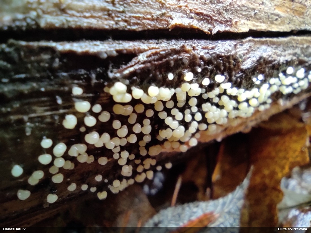 Nu jāā.. Pēc kopskata domājams, ka ļoti reti novērota suga, pēc pašreizējām zināšanām - Badhamia foliicola vai Physarum cinereum. Bet dikti agri! Varētu šogad papētīt, vai tur kas līdzīgs neuzaug. :D