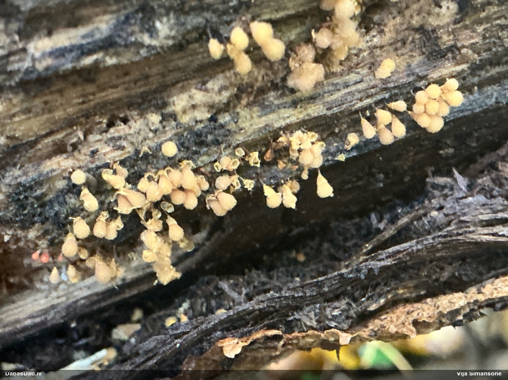 Šīs varētu būt jaunas pumpurītes (Physarum sp.) vai lampītes (Lamproderma sp.)