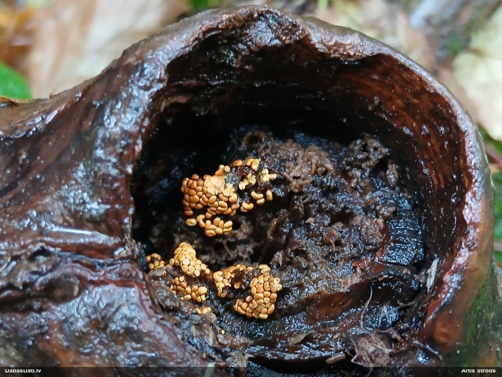 Paldies, Iveta! Julita, kā redzi – nevis dzīvs, bet tikai pusdzīvs ;) Par atrašanu – joprojām darbojos pēc principa bez piecām/sešām atrastām sugām no 250x250 m kvadrāta ārā neiet. Ja nav kritalu – rāpoju pa sūnām. Šis bija viens no kvadrātiem bez sugām, izvēlējos kritalu, tā bija patukša, blakus kritalai pamanīju šīs gļotsēnes. Beigās šajā vietā esmu iesprūdis, būs vēl daži interesanti atradumi. Tik jāatrod laiks mikroskopēšanai, sugu noteikšanai un salikšanai DD. Laika kā reiz šobrīd ļoti maz un brīvajos brīžos drīzāk gribas atkal aizskriet uz savu sūnu pleķi :) Par nosaukumu – domāju, ka rīkojamies līdzīgi kā ar Tavu Diachea (bij. Craterium) muscorum – tā kā šai sugai mums nav iegājies krāterītes nosaukums, saucam par vizulīti. Kaut, piekrītu, drīzāk izskatās pēc krāterītes.