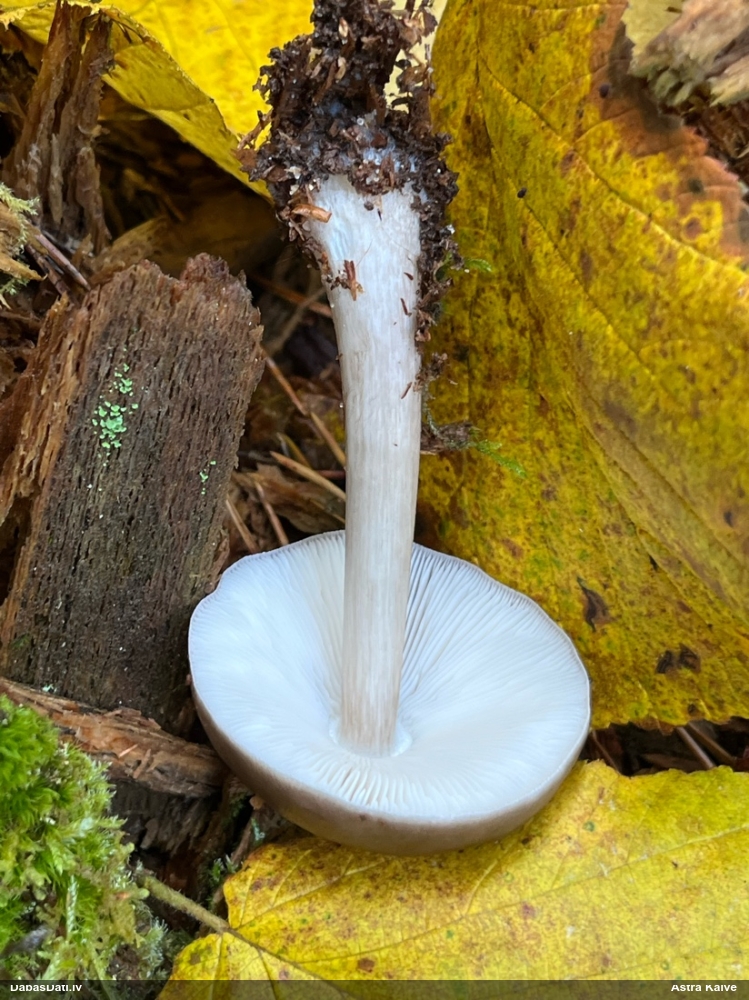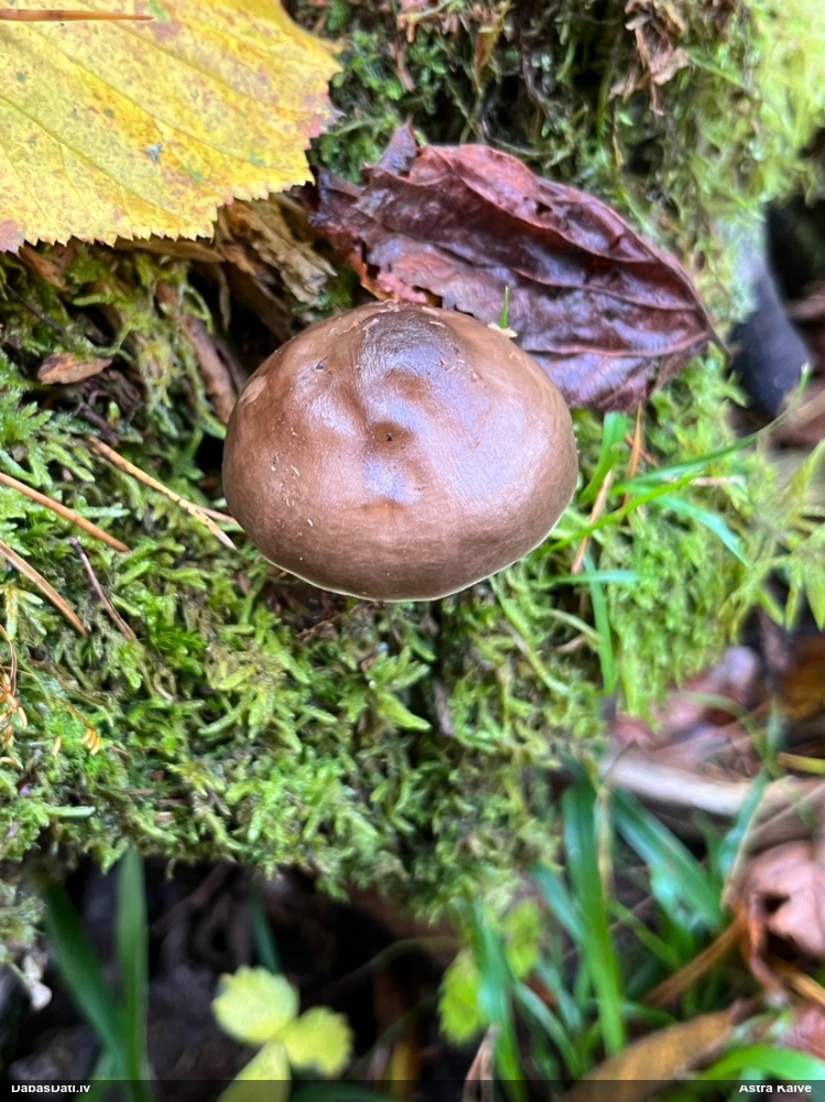 Ļoti neparasta kombinācija - īsa melna kājiņa un apaļīgi plakana galviņa. Un uz nobirām. Gļotsēņu atslēga kā cerīgāko piedāvā nabas jāņodzīti, bet tai neredzu "nabiņu" un nobirām arī nav raksturīga. Šķirstot noteicēju, visas līdzīgās atduras pret pēcsniedzītēm, kas gluži nevarētu būt :D Olītēm melnas kājiņas nav tipiskas (ja tiešām melna), tad paliek lampītes. Par garkājas lampīti (kā blakus) vismaz pagaidām šo nosaukt grūti ;) Atliek cerēt, ka nobriedīs tiktāl, lai mistēriju izdotos atrisināt :)
