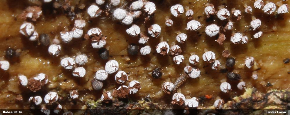Nevar saprast, uz kā auga - vai tas ir nobirās, vai uz kritalas mizas? Abas hipotēzes ir "pa tēmu", bet man "nepatīk" kopskats, kur skaidri redzams, ka vairāki augļķermeņi ir cieši kopā, bet tas nav raksturīgs ne vienai, ne otrai hipotēzei, kur augļķermeņi tipiski ir nodalīti. Ļoti interesanti, ja ir paraugs, tad kāds tas izskatās tagad, un vispār to vajadzētu mikroskopēt.