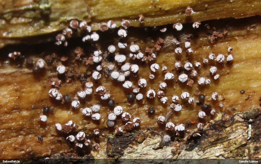 Šobrīd varu iedomāties 2 variantus - melnā plaispika Amaurochaete atra vai parastais gļotpūpēdis Reticularia lycoperdon. Pēc izmēra, augšanas laika un augšanas uz apstrādāta koka atbilst abas.