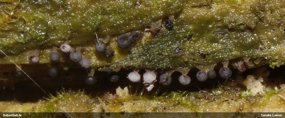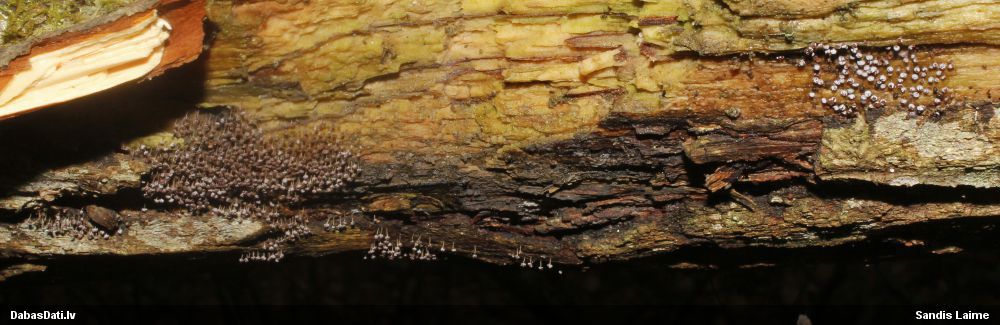 NotesDivās vietās uz Salix sp. kritalas - viena lielāka grupiņa netālu no nokarenajām fizārām (tās mērogam 3. foto), otra mazāka turpat netālu - ērti nobildējamas profilā; izskatās, ka redzamas vairākas stadijas - melnās un tumši pelēkās, iespējams, jaunākas, sporu stadijā paliek pelēkas; sporu masa brūna; visām kātiņi tādi kā caurspīdīgi-dzeltenīgi; pagaidām izskatās, ka kāda no Badhamia sp., bet līdz sugai netieku