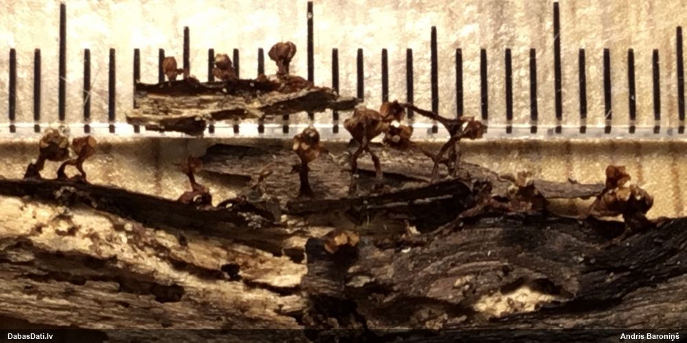Nevar saprast, uz kā auga - vai tas ir nobirās, vai uz kritalas mizas? Abas hipotēzes ir "pa tēmu", bet man "nepatīk" kopskats, kur skaidri redzams, ka vairāki augļķermeņi ir cieši kopā, bet tas nav raksturīgs ne vienai, ne otrai hipotēzei, kur augļķermeņi tipiski ir nodalīti. Ļoti interesanti, ja ir paraugs, tad kāds tas izskatās tagad, un vispār to vajadzētu mikroskopēt.