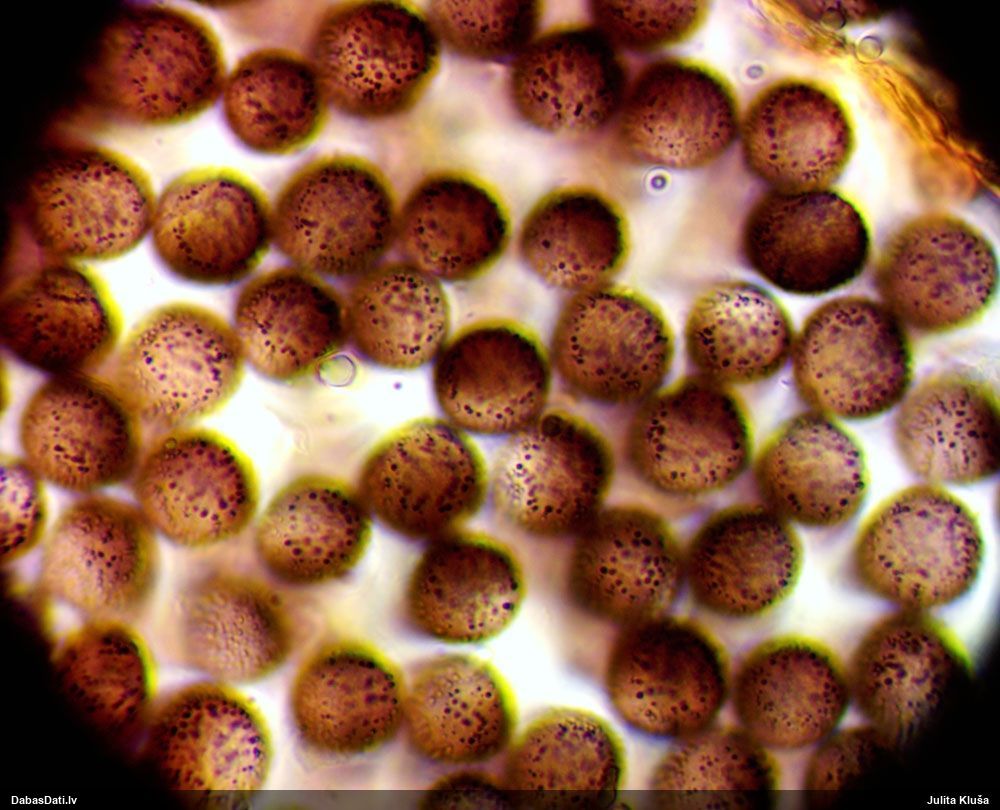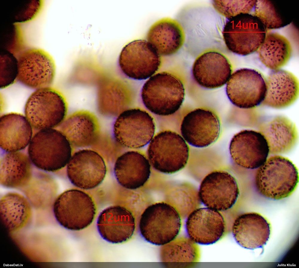 Paldies, Raivo! Ar acu gaišumu man arvien sliktāk, bet mikroskops palīdz. Jā, gribēju teikt, ka paraugam, ja vien nav kāda jutīga atradne, kurai drīkst ievākt tikai mazu gabaliņu, vērts ievākt lielāku gabalu, jo gļotsēnēm patīk kompānija. Un mikroskopa mazajos palielinājumos ar sānu papildus apgaismojumu ir vērts rūpīgi "izstaigāt" visu paraugu. Arī ķērpjus un interesantas sīksēnītes tā var atrast, ko dabā nepamanītu. Ar kriksītēm ir dažādi - pirmās es tā arī tikai citu sugu paraugos pamanīju, bet vēlāk redzēju arī dabā kriskīšu plantācijas - ja to ir daudz, tad var pamanīt jau dabā. Uz sūnām gan ir ekstrēms gadījums, dabā droši nepamanītu, arī eksemplāra noņemšana no sūnas nebija pārāk veiksmīga, tāpēc par noteikšanu mazliet šaubos (sporām mazliet cits tonis). Bet pagaidām citas hipotēzes nav (un konkrētā eksemplāra arī vairs ne).