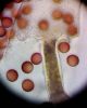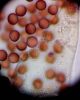 Kaut kas interesants :) Rudenī gļotsēnes attīstās lēnāk. Un ne vienmēr var uzminēt, kad tās ir gatavas sporu stadijai, resp., kā organizēt mitrumu. Vai šobrīd tiek mitrināts un viņas redz "dienas gaismu"? Iespējams, tās ir kādas olītes (Diderma). Reizēm tās pietiek palikt zem siltas lampas, un tās acu priekšā (sekunžu laikā) nobriest, maina krāsu, apvalciņš saplaisā un viss gatavs. Reizēm tā var sabojāt paraugu ;) Ja paraugs liels, var paeksperimentēt ar daļu, mēģinot pasildīt. Vēl pēc pāris dienām, ja nekas nemainītos, man droši vien beigtos pacietība, un es tādu pašu "iemestu mikroskopā", ja nu brieduma pietiek noteikšanai.
