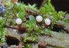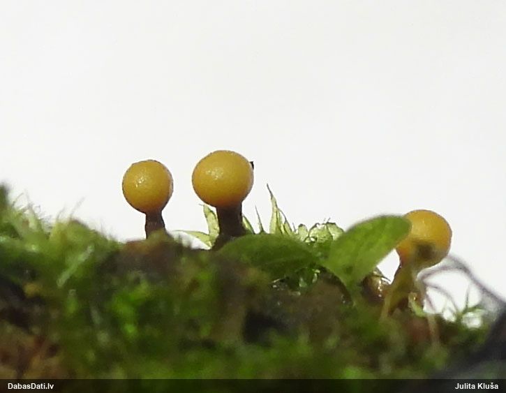 Man pēkšņi radās ideja - vai tur bija nu ļoti mitrs mikroklimats, egle ar melnalksni? Hipotētiski tādas dzeltenas var būt Diachea muscorum. Te bilde ir mazliet līdzīga: https://fr.wikipedia.org/wiki/Fichier:Craterium_muscorum,_Trawscoed,_North_Wales,_Aug_2016_-_Flickr_-_janetgraham84.jpg