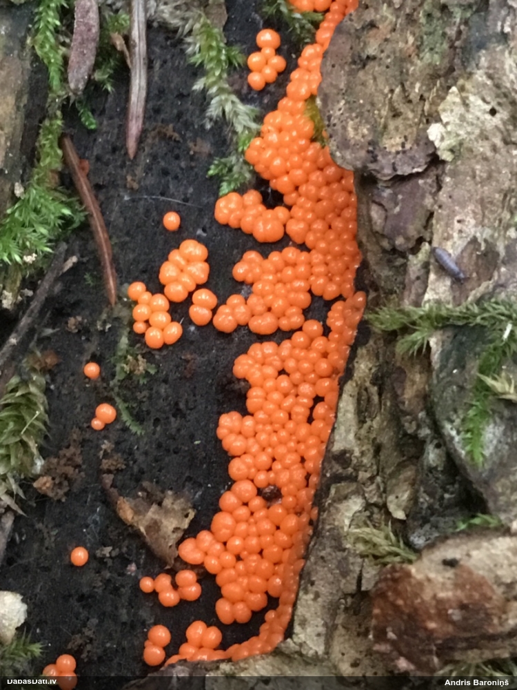 Skatoties uz nelīdzeno virsmu, var būt grubuļainais Fuligo luteonitens, bet droši to varētu pateikt mikroskopijā pēc sporām
