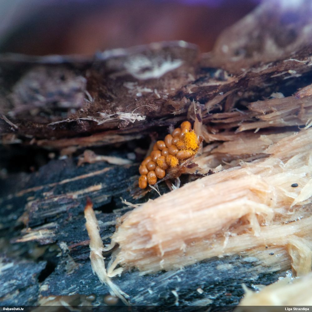 Nevar saprast, uz kā auga - vai tas ir nobirās, vai uz kritalas mizas? Abas hipotēzes ir "pa tēmu", bet man "nepatīk" kopskats, kur skaidri redzams, ka vairāki augļķermeņi ir cieši kopā, bet tas nav raksturīgs ne vienai, ne otrai hipotēzei, kur augļķermeņi tipiski ir nodalīti. Ļoti interesanti, ja ir paraugs, tad kāds tas izskatās tagad, un vispār to vajadzētu mikroskopēt.