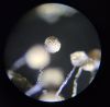 Un ja ir Badhamia, tad vajag arī uz stikliņa bez virsstikliņa mazos palielinājumos (lai nesaslapina okulāru) paskatīties, vai sporas negrupējas, pa divi vai vairāk. Te sporas izskatās ļoti apaļas, drīzāk negrupējas, bet paskatīties tāpat ir vērts.