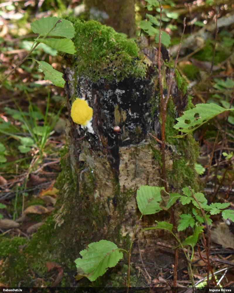 Šis ļoti interesants. Sporas ļoti traumētas, bet tām, kas ir veselas, ir diezgan skaidrs raksts, kas neatbilst nekam no man zināmiem ragansviestiem vai pumpurītēm (pat neņemot vērā izmēru), bet tīri labi atbilst baltapaļajai krāterītei, kas tā nevar būt, jo parauga "ciešais kamoliņš" ir stipri lielāks par tādu. Sporas pēc izmēra varētu atbilst Fuligo licentii, bet no dzeltenā te ir stipri maz. Ja vienīgi ir kāds nobriedušāka attēls, kas rāda, ka ir bijis dzeltens, bet no ilgas stāvēšanas izbalējis.