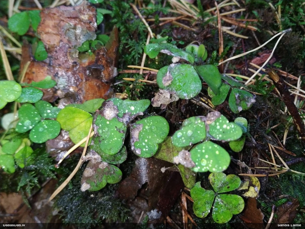 Notes/zaķkāposti, blakus rūsaine, arī stāvaine, priedes zariņš, p7 sausumā zem pārkārušās priedes kritalas
