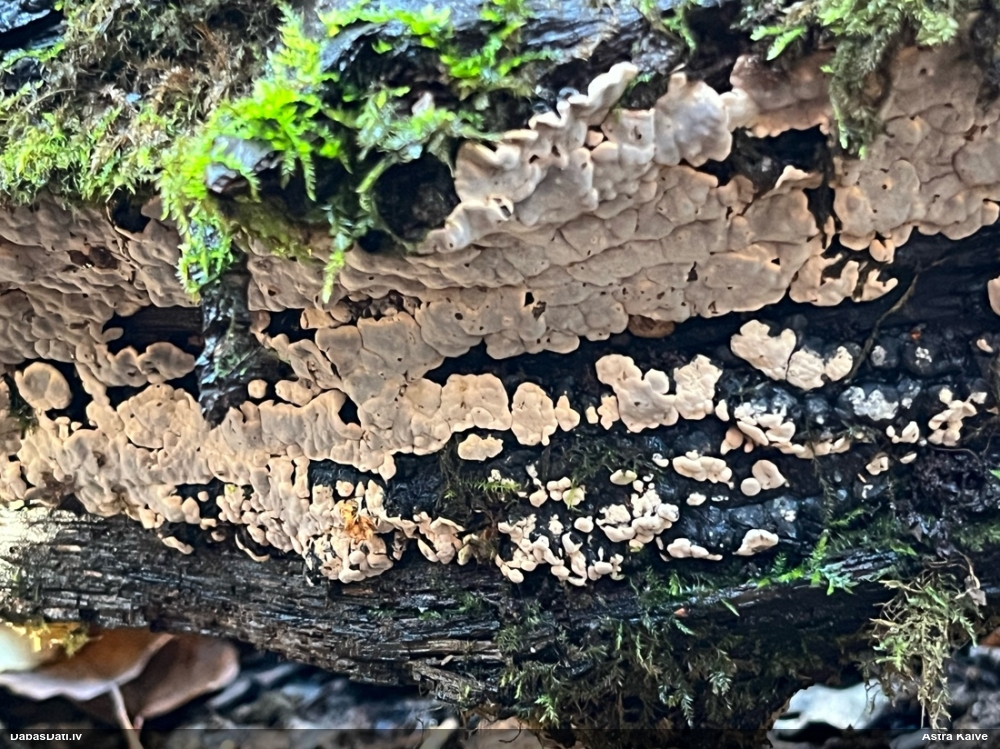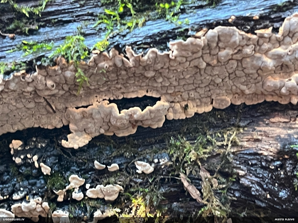 Varētu būt P.album, bet netipiski šķita, ka auga arī uz sūnām un vertikāli, ne kā pierasts redzēt uz koksnes un nokareni.