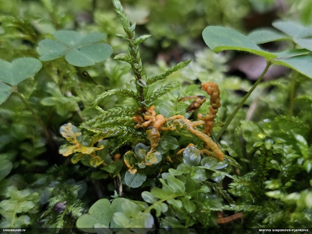 Man pēkšņi radās ideja - vai tur bija nu ļoti mitrs mikroklimats, egle ar melnalksni? Hipotētiski tādas dzeltenas var būt Diachea muscorum. Te bilde ir mazliet līdzīga: https://fr.wikipedia.org/wiki/Fichier:Craterium_muscorum,_Trawscoed,_North_Wales,_Aug_2016_-_Flickr_-_janetgraham84.jpg