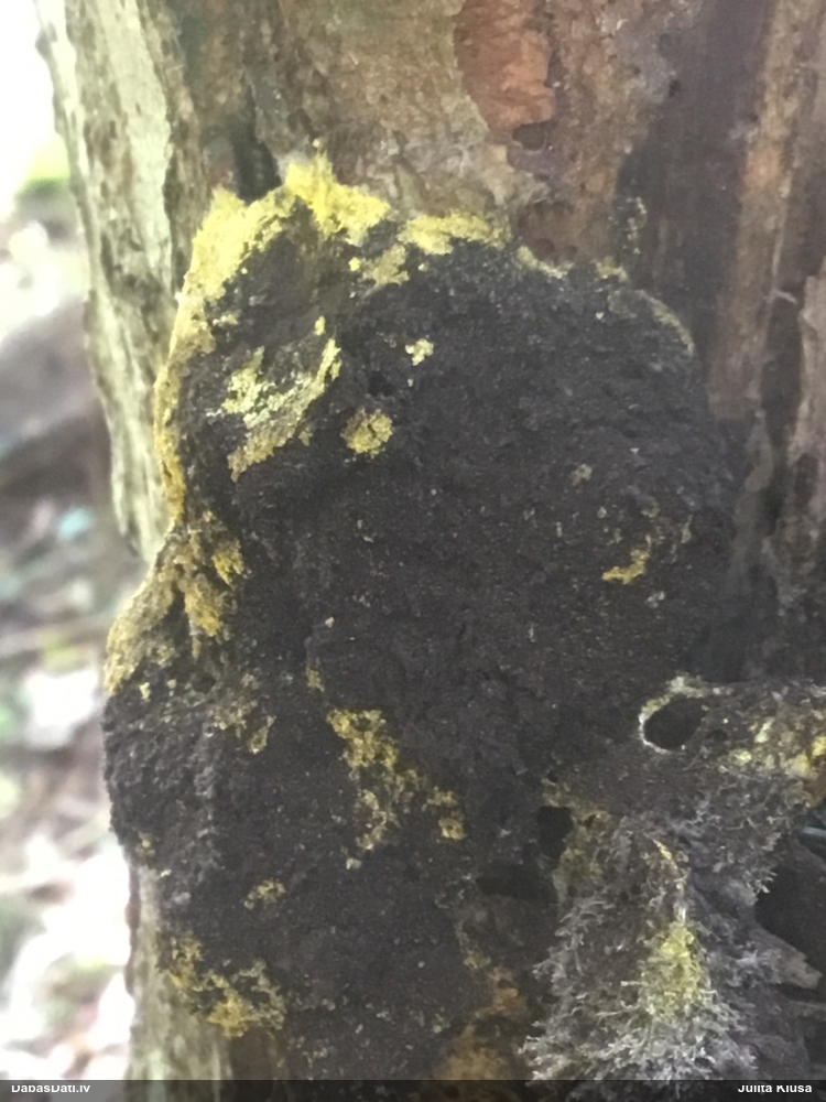 Tas ir lieliski! :) Jā, sporas atbilst, tur laikam nav šaubu. Vienīgā līdzīgā ar tādām sporām ir Diacheopsis insessa, kurai būtiski atšķiras kapilīcijs, kas pagaidām nav novērots, bet tā, cik atradu, novērota uz ķērpjiem uz dzīvu lapukoku stumbriem (bērzs, kalnu kļava). Viena no retajām ģints sugām, kas nav pēcsniedzīte. Ļoti reta un reģistrēta tikai 7 valstīs. [Raivo, izskatās, ka šī suga varētu būt Tev nākamais līmenis :)))] Raivo īpašas uzslavas par uzcītību, meklējot Diacheopsis resinae trīs sezonas pēc kārtas! Liels iedvesmas avots tagad sasparoties arī citiem - jāatrod vēl! :)) Paraugu, bez šaubām, gribēšu, kapilīciju vajadzētu atrast, jo galu galā visas sugas zinātnē jau nav vēl aprakstītas. Tas ķidātais eksemplārs ir pilnībā izķidāts, vai kādas paliekas vēl no tā ir palikušas? Cik saprotu, paaugstināta grūtība atrast, jo jāmeklē melns uz melna, ne gluži uz pašiem sveķiem? Būs skaidrāka vīzija, kur skatīties!