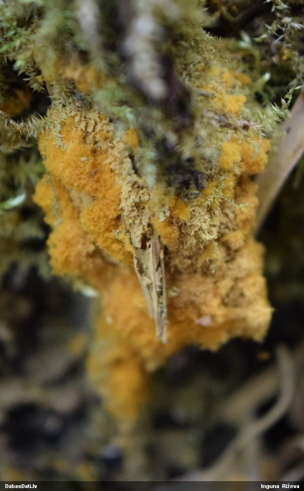 Nevar saprast, uz kā auga - vai tas ir nobirās, vai uz kritalas mizas? Abas hipotēzes ir "pa tēmu", bet man "nepatīk" kopskats, kur skaidri redzams, ka vairāki augļķermeņi ir cieši kopā, bet tas nav raksturīgs ne vienai, ne otrai hipotēzei, kur augļķermeņi tipiski ir nodalīti. Ļoti interesanti, ja ir paraugs, tad kāds tas izskatās tagad, un vispār to vajadzētu mikroskopēt.