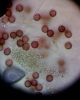 Šis ļoti interesants. Sporas ļoti traumētas, bet tām, kas ir veselas, ir diezgan skaidrs raksts, kas neatbilst nekam no man zināmiem ragansviestiem vai pumpurītēm (pat neņemot vērā izmēru), bet tīri labi atbilst baltapaļajai krāterītei, kas tā nevar būt, jo parauga "ciešais kamoliņš" ir stipri lielāks par tādu. Sporas pēc izmēra varētu atbilst Fuligo licentii, bet no dzeltenā te ir stipri maz. Ja vienīgi ir kāds nobriedušāka attēls, kas rāda, ka ir bijis dzeltens, bet no ilgas stāvēšanas izbalējis.