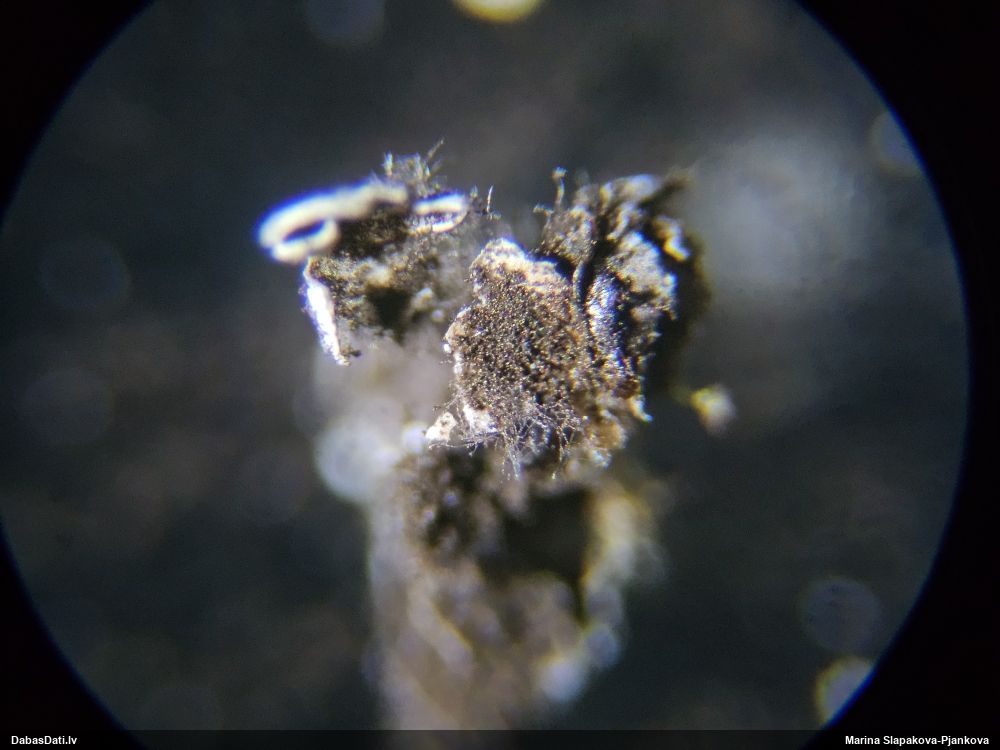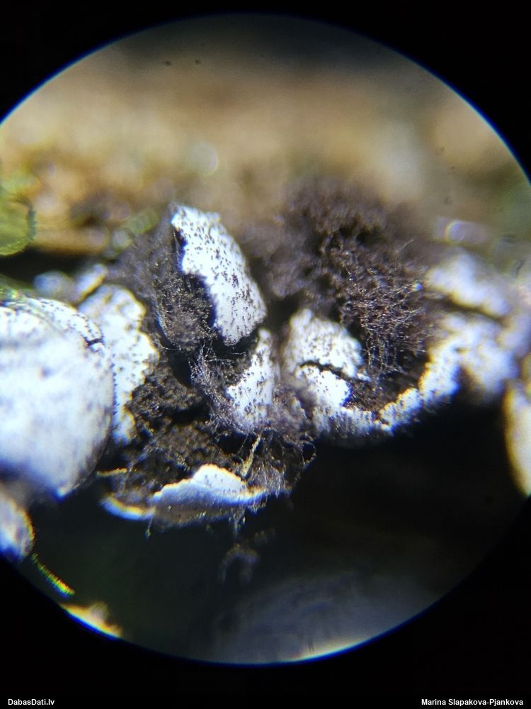 Paldies par paraugu! Paraugā augļķermeņi gan bija ļoti cieti, līdz galam nenobrieduši. Jauna eksemplāra krāsa var būt nozīmīga noteikšanā, bet svarīgi arī nobriedināt (turot mitrākā vietā), citādi perīdiju noņemt mikroskopēšanai ir praktiski neiespējami. Šajā gadījumā mazu gabaliņu izdevās atmiekšķēt un nodabūt, kas sarežģītākos gadījumos varētu būt nepietiekami. Pēc izmēra un perīdija pazīmēm te varētu būt divi varianti L.irregularis un L.epidendrum, kas esot viens no grūtāk atšķiramajiem sugu pāriem. L.epidendrum vairāk raksturīgi, kā es tos saucu, pārstaipi uz augļķermeņa virsmas, kas te ir ļoti labi redzami, tāpēc izšķīros par parastāko sugu.