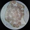 Ko pēc mikroskopētā var secināt: * sporas ir tumšas, tātad ir cukurīšu (Didymiaceae) vai pumpurīšu dzimta (Physaraceae) * sporas ir gan plusmīnus apaļas, gan garenas, gan vēl visādi izlocītas, tātad paraugs nav pilnvērtīgi nobriedis, jo normāli sporām jābūt visām līdzīgas formas, katrā ziņā vismaz pret vienu asi simetriskām. Ja ir nepilnvērtīgi nobriedis paraugs, tad sporu izmēram jāņem mazākās simetriskākās sporas. Šajā gadījumā normāli būtu jābūt apaļām sporām, tāpēc garenajām nevajadzētu mērīt pa garāko diametru. Labāk pamaklēt iespējami apaļākās sporas. * Ja sporas ir deformētas, tad mērījumus vajag veikt vairākkārtīgi, nu vismaz 3 reizes, vai nu tajā pašā mikroskopijā vēl arī pavisam citā vietā, vai labāk pavisam jaunu porciju sporu paņemt no tā paša (ja maz augļķermeņu) vai vēl labāk no kāda hipotētiski labāk nobrieduša augļķwermeņa. Tad varēs labāk nojaust, cik varētu būt normālu sporu diametrs, resp., vai visos gadījumos ir līdzīgi izmēri, vai arī tie ļoti "lēkā", tad jāskatās, kurā gadījumā bija normālākās (tipiski arī mazākās) sporas. * Pēc attēlā ar mērījumiem redzamā es secinātu, ka sporu izmērs orientējoši ir 12-13 mkm. Sporām vērts mērīt (secināt) ar precizitāti līdz 0,5 mkm, lielākai "precizitātei" nav jēgas, jo tur nāk klāt arī mērījuma kļūda. Tomēr te ir tikai viens mērījums dažām redzamām sporām, tāpēc droši pateikt nevar. * Tumšsporainajām ļoti svarīgs ir sporu raksts, kuru var palaimēties nomanīt arī nepilnīgi nobriedušām sporām, kas reizēm "glābj", ja sporu izmēru precīzi grūti pateikt. Ļoti nenobriedušām sporām diemžēl arī raksts mēdz būt nenobriedis. Konkrētajā gadījumā, ja tiešām būtu jāizšķiras starp Physarum psittacinum un Diderma tigrinum (es patiesībā cerētu vispār uz jaunu sugu Latvijai), tad būtu jāsaskata, vai ir vienmērīgi izvietotas kārpas (Diderma tigrinum) vai kārpas ar tumšāku kārpu grupām (Physarum psittacinum). Mikroskopijā es kārpas īsti neredzu vispār, tāpēc man ir jautājums, vai tas ir tāpēc, ka sporas pagalam nenobriedušas (it kā tik traki nevajadzētu būt) vai arī mikroskopijā nav pareizi fokusēts (vajag fokusēt šauri uz sporas centru, lai redz rakstiņu) Attiecīgi par sporu rakstu es neko nevaru pateikt. * kapilīcijs gļotsēņu "pamatu" noteikšanai (kāda dzimta, ģints) ir pats svarīgākais. Ja nav kapilīcija, tad var noteikt tikai dažos izņēmuma gadījumos (lielākoties vienkāršos, vai ja ir liela pieredze). Sporas var izskatīties identiskas arī dažādu dzimtu gļotsēnēm. Lai tiktu pie kapilīcija, sarežģītākos gadījumos uz stikliņa jāņem iespējami viss augļķermenis un, tā kā tas var būt "biezs", tad to starp stikliņiem "izsmērē" tiktāl, lai sāk atsegties (mikroskopijā kļūst redzamas) iekšējās struktūras. Jāredz vismaz kaut kādas daļas, krāsa. Ja tā būtu olīte (Diderma), tad kapilīcijs būtu skaidri brūni-balti pavedieni. Ja tā ir pumpurīte (Physarum), tad pavedieni ir caurspīdīgi un var būt ļoti grūti saskatāmi. Tad jāmeklē kapilīcija mezgli, kas ir apaļu kaļķa granulu sakopojumi. Ja paraugs kārtīgi tiek "izsmērēts" tad tie mezgli arī var "izsmērēties", tad vnk redz, ka paraugs pilns ar apaļām kaļķa granulām (tās redzamas arī šajā mikroskopijā). Vispār apaļas kaļķa granulas ir arī olītēm (uz galviņas), tāpēc pašas par sevi tās neliecina vienas vai otras dzimtas virzienā. Pumpurītēm (Physarum) parasti kapilīciju (t.i., tā mezglus) saskata mazos palielinājumos mikroskopā, vēl neliekot paraugu starp stikliņiem. Tikai jābūt atsegtām iekšējām struktūrām. Tad redz, ka ir tādi kaļķa sakopojumi iekšpusē. Gala secinājumi no tā, kas jau ir redzams - paraugs ir nepilnīgi nobriedis, kas pēc sporu izmēriem vairāk atbilstu Diderma tigrinum (vajag 10-13µm, bet redzamās 12-13µm nepilnīgi nobriedušām sporām ir ļoti atbilstošas), taču olītēm kapilīcijam būtu jābūt vieglāk ievērojamam, tomēr tā te nav. Priekš Physarum psittacinum sporas ir stipri par lielu, ar tādām novirzēm sugu noteikti nevarētu apstiprināt, turklāt būtu jāsaskata tumšāku kārpu grupas. Bet es nepavisam negribētu apstāties pie šīm divām hipotēzēm, kurām biotops īsti neatbilst. Varbūt ir kāda mums mazāk zināma ģints, tāpēc ļoti labprāt saņemtu paraudziņu 28. martā. Tik gari rakstu arī priekš sevis, jo grāmatai man svarīgi saprast, ko iesācējam (un ne tikai) svarīgi izskaidrot, lai tiktu līdz rezultātam. Visi "parastie" noteicēji ir gadījumiem, ja ir visas sastāvdaļas zināmas, un kapilīcijs ir visupirmais.