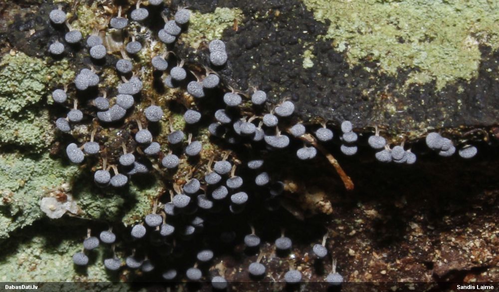 Nu jāā.. Pēc kopskata domājams, ka ļoti reti novērota suga, pēc pašreizējām zināšanām - Badhamia foliicola vai Physarum cinereum. Bet dikti agri! Varētu šogad papētīt, vai tur kas līdzīgs neuzaug. :D