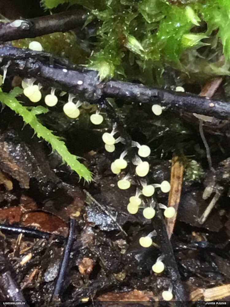 Jā, auga uz sūnām krietni apaugušas kritalas, kolumella apm1/3 no galviņas diametra, galviņas diametrs ap 1mm. Kājiņa praktiski nav, izskatās, ka galviņa "sēž" uz sakaltuša plazmodija pārpalikuma. Sporas varu vēl pārmērīt, varūt kāda būs 9mkm, bet mazāk gan šķiet ka nē.