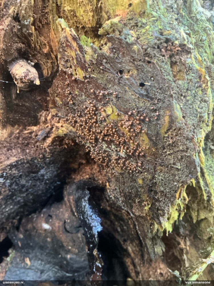 Paldies, Iveta! Julita, kā redzi – nevis dzīvs, bet tikai pusdzīvs ;) Par atrašanu – joprojām darbojos pēc principa bez piecām/sešām atrastām sugām no 250x250 m kvadrāta ārā neiet. Ja nav kritalu – rāpoju pa sūnām. Šis bija viens no kvadrātiem bez sugām, izvēlējos kritalu, tā bija patukša, blakus kritalai pamanīju šīs gļotsēnes. Beigās šajā vietā esmu iesprūdis, būs vēl daži interesanti atradumi. Tik jāatrod laiks mikroskopēšanai, sugu noteikšanai un salikšanai DD. Laika kā reiz šobrīd ļoti maz un brīvajos brīžos drīzāk gribas atkal aizskriet uz savu sūnu pleķi :) Par nosaukumu – domāju, ka rīkojamies līdzīgi kā ar Tavu Diachea (bij. Craterium) muscorum – tā kā šai sugai mums nav iegājies krāterītes nosaukums, saucam par vizulīti. Kaut, piekrītu, drīzāk izskatās pēc krāterītes.