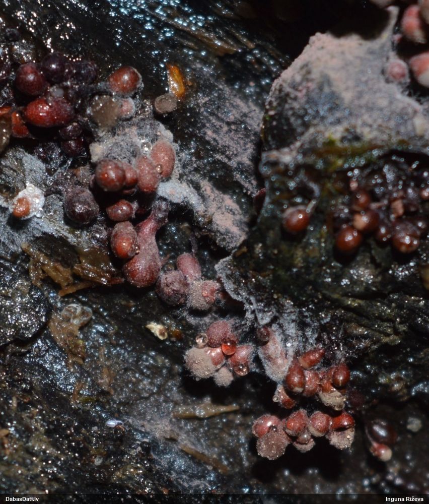 Ja uz beigta koka, tad ticamākā laikam ir B.affinis var. microspora, lai gan tā aug uz mizas. Bet varbūt tieši apakšā gļotsēnēm ir kādi mizas fragmentiņi?