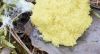 Šis ļoti interesants. Sporas ļoti traumētas, bet tām, kas ir veselas, ir diezgan skaidrs raksts, kas neatbilst nekam no man zināmiem ragansviestiem vai pumpurītēm (pat neņemot vērā izmēru), bet tīri labi atbilst baltapaļajai krāterītei, kas tā nevar būt, jo parauga "ciešais kamoliņš" ir stipri lielāks par tādu. Sporas pēc izmēra varētu atbilst Fuligo licentii, bet no dzeltenā te ir stipri maz. Ja vienīgi ir kāds nobriedušāka attēls, kas rāda, ka ir bijis dzeltens, bet no ilgas stāvēšanas izbalējis.