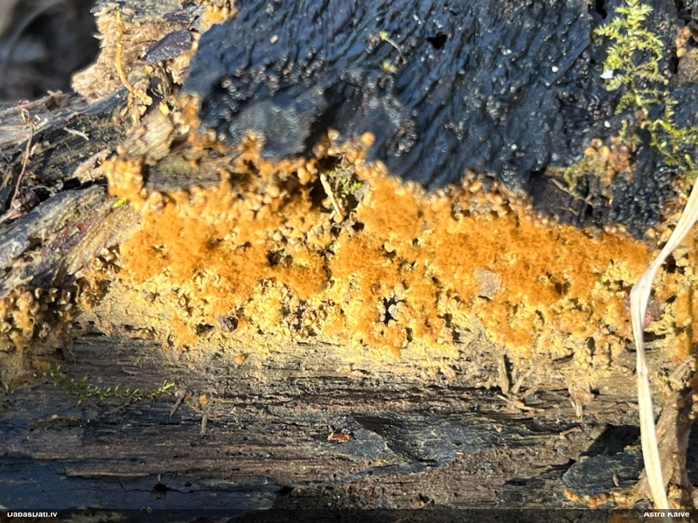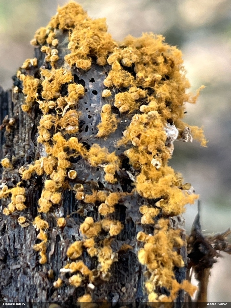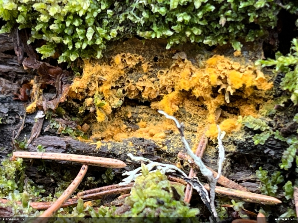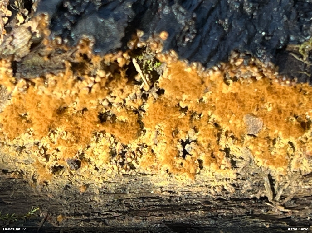 Mikroskopēju ievākto paraugu. Sporas pēc morfoloģijas un izskata atbilstošākas Physarum psittacinum, nevis Diderma tigrinum. Pašu sporu izmērs gan ir par lielu, salīdzot ar aprakstu. Kapilīcijs grieztajā paraugā netika novērots. Pie sevis domāju, vai iespējams kāds trešais variants, vai arī sporas ir deformētas..