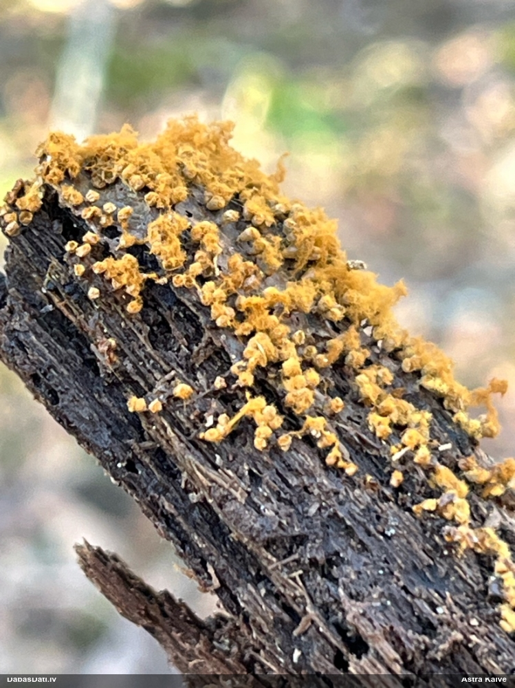 1. un 3. foto droši vien Hemitrichia decipiens, bet 2. foto sporu mākonis bez brīviem galiem un kausiņa malas izskatās atlocītas - varētu būt Hemitrichia calyculata. Mikroskopiski to 1000x palielinājumā var pārbaudīt- Hemitrichia calyculata sporas būs gaišas, tīkliņu grūti saskatīt. H.clavata sporas ir tumšāk dzeltenas, tīkliņu labāk var saskatīt un apkārt vēl skaidri redzams tīkla gredzens. Izmēri arī mazliet atšķiras - H.calyculata tipiski 6,5-7,5 mkm (reti līdz 8 mkm), kamēr H.clavata 7,5-9 (10) mkm