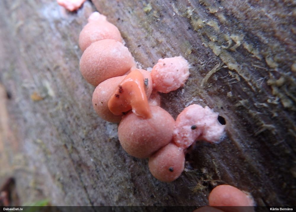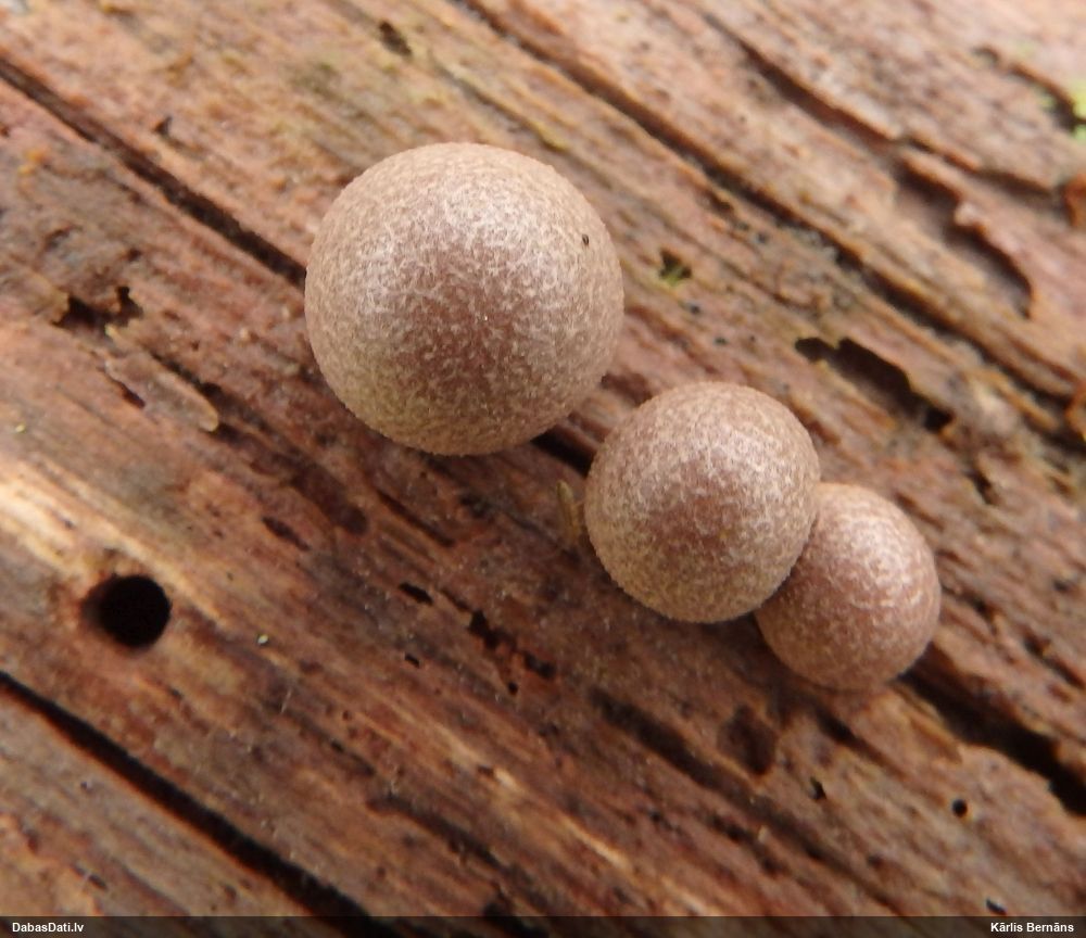 Paldies par paraugu! Paraugā augļķermeņi gan bija ļoti cieti, līdz galam nenobrieduši. Jauna eksemplāra krāsa var būt nozīmīga noteikšanā, bet svarīgi arī nobriedināt (turot mitrākā vietā), citādi perīdiju noņemt mikroskopēšanai ir praktiski neiespējami. Šajā gadījumā mazu gabaliņu izdevās atmiekšķēt un nodabūt, kas sarežģītākos gadījumos varētu būt nepietiekami. Pēc izmēra un perīdija pazīmēm te varētu būt divi varianti L.irregularis un L.epidendrum, kas esot viens no grūtāk atšķiramajiem sugu pāriem. L.epidendrum vairāk raksturīgi, kā es tos saucu, pārstaipi uz augļķermeņa virsmas, kas te ir ļoti labi redzami, tāpēc izšķīros par parastāko sugu.