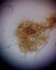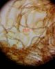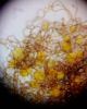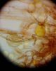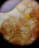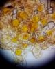 Šis bij pārsteigums. Ievācu bez cerībām, jo sakaltis. Hipotēze par gļotsēni, jo gļotaina apmale. Tā kā balts, sporu nebūs, neko zaudēt nevar, ielēju kastītē ūdeni (pat ne salvetes, vnk "dzīvu ūdeni") un aizmirsu. Krāmējoties pa kastītēm, atveru un - pārsteigums. Plānotā gļotsēne izaugusi 100x lielāka :D un izrādās sēne, kas mitrumā beidzot uzbriedusi. Kā tādu mikroskopēt, gan nezinu, jo tur tak receklis.. Tā ka vai pēdējie 2 mikro-foto par tēmu - nezinu.