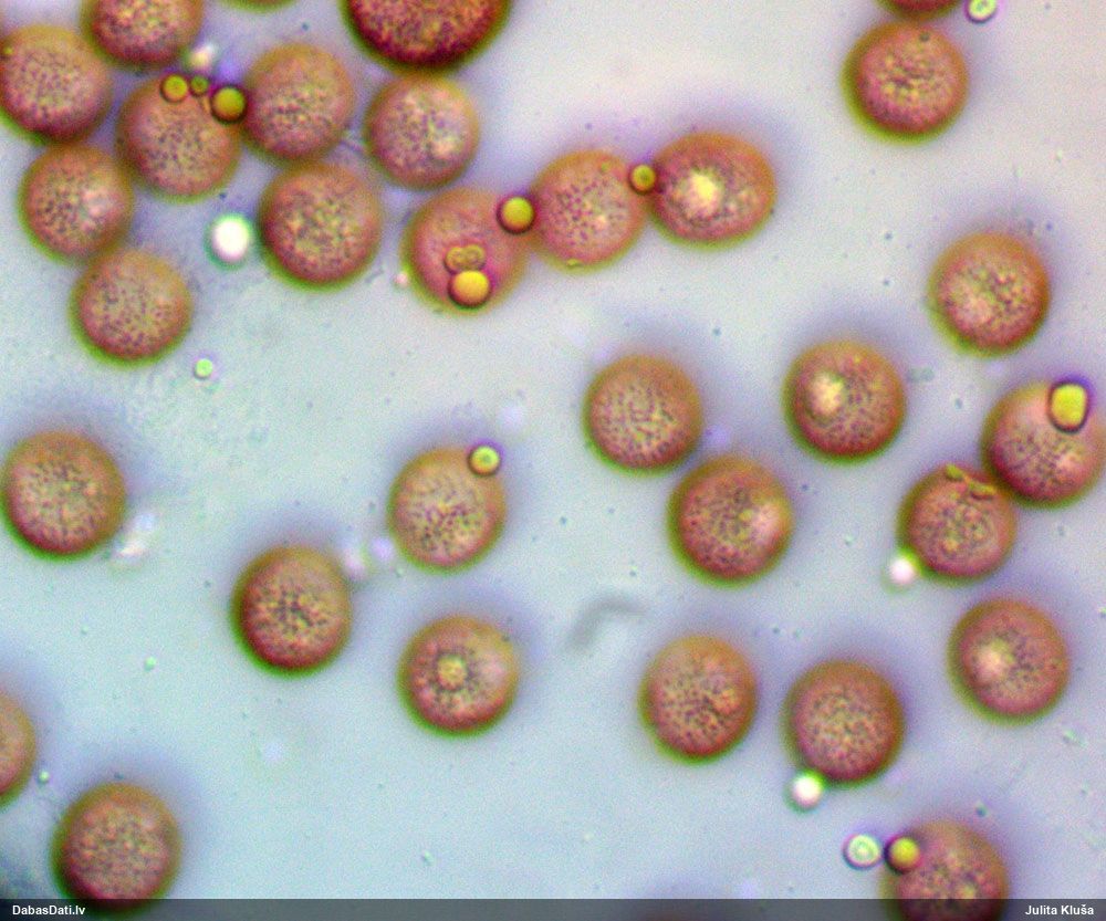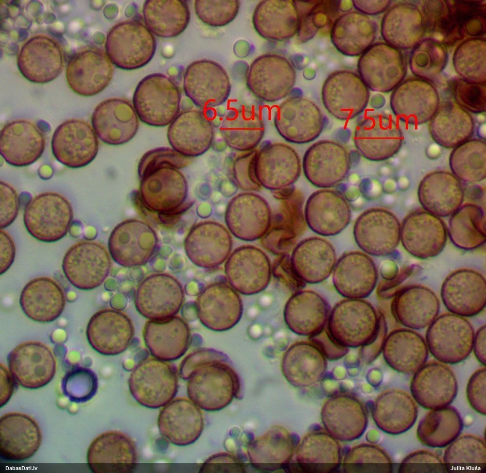Sporu izmēri ir tieši starp rufu (6-7 mkm) un dzelteno (7-8 mkm) - nav brīnums, ka izskatās arī kkas pa vidam :D. Bet nu paraugā paliekas izskatās tīri dzeltenas, rūsganais nav parādījies, un sporām arī "velk" vairāk uz 8 mkm nekā uz 6 mkm, tā ka būs vien flava. Liels paldies, vēl viena laba pieredze ar jaunas krāsu un mikroskopiju!