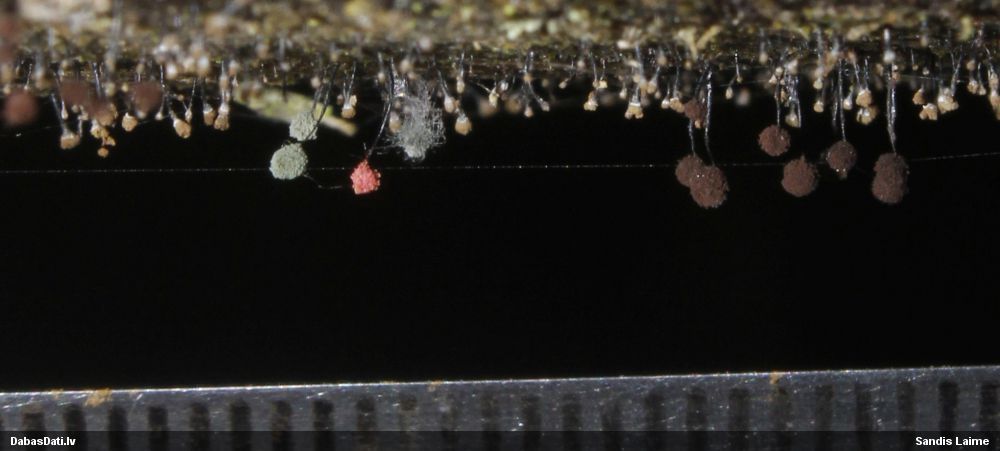 PiezīmesUz priedes kritalas apakšpuses, kopā ar melnajām komatrihijām. Nez, vai šī arī būtu ar kaut kādu spilgtu pelējuma sēni apaugusi melnā komatrihija?