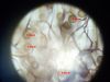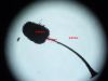 Ko pēc mikroskopētā var secināt: * sporas ir tumšas, tātad ir cukurīšu (Didymiaceae) vai pumpurīšu dzimta (Physaraceae) * sporas ir gan plusmīnus apaļas, gan garenas, gan vēl visādi izlocītas, tātad paraugs nav pilnvērtīgi nobriedis, jo normāli sporām jābūt visām līdzīgas formas, katrā ziņā vismaz pret vienu asi simetriskām. Ja ir nepilnvērtīgi nobriedis paraugs, tad sporu izmēram jāņem mazākās simetriskākās sporas. Šajā gadījumā normāli būtu jābūt apaļām sporām, tāpēc garenajām nevajadzētu mērīt pa garāko diametru. Labāk pamaklēt iespējami apaļākās sporas. * Ja sporas ir deformētas, tad mērījumus vajag veikt vairākkārtīgi, nu vismaz 3 reizes, vai nu tajā pašā mikroskopijā vēl arī pavisam citā vietā, vai labāk pavisam jaunu porciju sporu paņemt no tā paša (ja maz augļķermeņu) vai vēl labāk no kāda hipotētiski labāk nobrieduša augļķwermeņa. Tad varēs labāk nojaust, cik varētu būt normālu sporu diametrs, resp., vai visos gadījumos ir līdzīgi izmēri, vai arī tie ļoti "lēkā", tad jāskatās, kurā gadījumā bija normālākās (tipiski arī mazākās) sporas. * Pēc attēlā ar mērījumiem redzamā es secinātu, ka sporu izmērs orientējoši ir 12-13 mkm. Sporām vērts mērīt (secināt) ar precizitāti līdz 0,5 mkm, lielākai "precizitātei" nav jēgas, jo tur nāk klāt arī mērījuma kļūda. Tomēr te ir tikai viens mērījums dažām redzamām sporām, tāpēc droši pateikt nevar. * Tumšsporainajām ļoti svarīgs ir sporu raksts, kuru var palaimēties nomanīt arī nepilnīgi nobriedušām sporām, kas reizēm "glābj", ja sporu izmēru precīzi grūti pateikt. Ļoti nenobriedušām sporām diemžēl arī raksts mēdz būt nenobriedis. Konkrētajā gadījumā, ja tiešām būtu jāizšķiras starp Physarum psittacinum un Diderma tigrinum (es patiesībā cerētu vispār uz jaunu sugu Latvijai), tad būtu jāsaskata, vai ir vienmērīgi izvietotas kārpas (Diderma tigrinum) vai kārpas ar tumšāku kārpu grupām (Physarum psittacinum). Mikroskopijā es kārpas īsti neredzu vispār, tāpēc man ir jautājums, vai tas ir tāpēc, ka sporas pagalam nenobriedušas (it kā tik traki nevajadzētu būt) vai arī mikroskopijā nav pareizi fokusēts (vajag fokusēt šauri uz sporas centru, lai redz rakstiņu) Attiecīgi par sporu rakstu es neko nevaru pateikt. * kapilīcijs gļotsēņu "pamatu" noteikšanai (kāda dzimta, ģints) ir pats svarīgākais. Ja nav kapilīcija, tad var noteikt tikai dažos izņēmuma gadījumos (lielākoties vienkāršos, vai ja ir liela pieredze). Sporas var izskatīties identiskas arī dažādu dzimtu gļotsēnēm. Lai tiktu pie kapilīcija, sarežģītākos gadījumos uz stikliņa jāņem iespējami viss augļķermenis un, tā kā tas var būt "biezs", tad to starp stikliņiem "izsmērē" tiktāl, lai sāk atsegties (mikroskopijā kļūst redzamas) iekšējās struktūras. Jāredz vismaz kaut kādas daļas, krāsa. Ja tā būtu olīte (Diderma), tad kapilīcijs būtu skaidri brūni-balti pavedieni. Ja tā ir pumpurīte (Physarum), tad pavedieni ir caurspīdīgi un var būt ļoti grūti saskatāmi. Tad jāmeklē kapilīcija mezgli, kas ir apaļu kaļķa granulu sakopojumi. Ja paraugs kārtīgi tiek "izsmērēts" tad tie mezgli arī var "izsmērēties", tad vnk redz, ka paraugs pilns ar apaļām kaļķa granulām (tās redzamas arī šajā mikroskopijā). Vispār apaļas kaļķa granulas ir arī olītēm (uz galviņas), tāpēc pašas par sevi tās neliecina vienas vai otras dzimtas virzienā. Pumpurītēm (Physarum) parasti kapilīciju (t.i., tā mezglus) saskata mazos palielinājumos mikroskopā, vēl neliekot paraugu starp stikliņiem. Tikai jābūt atsegtām iekšējām struktūrām. Tad redz, ka ir tādi kaļķa sakopojumi iekšpusē. Gala secinājumi no tā, kas jau ir redzams - paraugs ir nepilnīgi nobriedis, kas pēc sporu izmēriem vairāk atbilstu Diderma tigrinum (vajag 10-13µm, bet redzamās 12-13µm nepilnīgi nobriedušām sporām ir ļoti atbilstošas), taču olītēm kapilīcijam būtu jābūt vieglāk ievērojamam, tomēr tā te nav. Priekš Physarum psittacinum sporas ir stipri par lielu, ar tādām novirzēm sugu noteikti nevarētu apstiprināt, turklāt būtu jāsaskata tumšāku kārpu grupas. Bet es nepavisam negribētu apstāties pie šīm divām hipotēzēm, kurām biotops īsti neatbilst. Varbūt ir kāda mums mazāk zināma ģints, tāpēc ļoti labprāt saņemtu paraudziņu 28. martā. Tik gari rakstu arī priekš sevis, jo grāmatai man svarīgi saprast, ko iesācējam (un ne tikai) svarīgi izskaidrot, lai tiktu līdz rezultātam. Visi "parastie" noteicēji ir gadījumiem, ja ir visas sastāvdaļas zināmas, un kapilīcijs ir visupirmais.