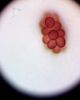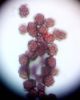 Šis bij pārsteigums. Ievācu bez cerībām, jo sakaltis. Hipotēze par gļotsēni, jo gļotaina apmale. Tā kā balts, sporu nebūs, neko zaudēt nevar, ielēju kastītē ūdeni (pat ne salvetes, vnk "dzīvu ūdeni") un aizmirsu. Krāmējoties pa kastītēm, atveru un - pārsteigums. Plānotā gļotsēne izaugusi 100x lielāka :D un izrādās sēne, kas mitrumā beidzot uzbriedusi. Kā tādu mikroskopēt, gan nezinu, jo tur tak receklis.. Tā ka vai pēdējie 2 mikro-foto par tēmu - nezinu.