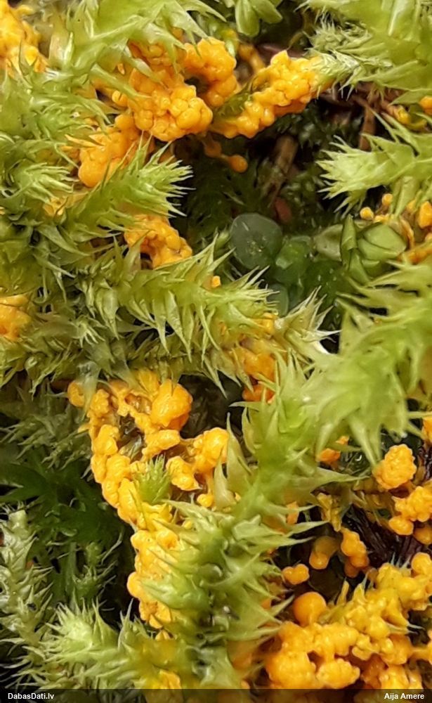 Paldies, Raivo! Ar acu gaišumu man arvien sliktāk, bet mikroskops palīdz. Jā, gribēju teikt, ka paraugam, ja vien nav kāda jutīga atradne, kurai drīkst ievākt tikai mazu gabaliņu, vērts ievākt lielāku gabalu, jo gļotsēnēm patīk kompānija. Un mikroskopa mazajos palielinājumos ar sānu papildus apgaismojumu ir vērts rūpīgi "izstaigāt" visu paraugu. Arī ķērpjus un interesantas sīksēnītes tā var atrast, ko dabā nepamanītu. Ar kriksītēm ir dažādi - pirmās es tā arī tikai citu sugu paraugos pamanīju, bet vēlāk redzēju arī dabā kriskīšu plantācijas - ja to ir daudz, tad var pamanīt jau dabā. Uz sūnām gan ir ekstrēms gadījums, dabā droši nepamanītu, arī eksemplāra noņemšana no sūnas nebija pārāk veiksmīga, tāpēc par noteikšanu mazliet šaubos (sporām mazliet cits tonis). Bet pagaidām citas hipotēzes nav (un konkrētā eksemplāra arī vairs ne).