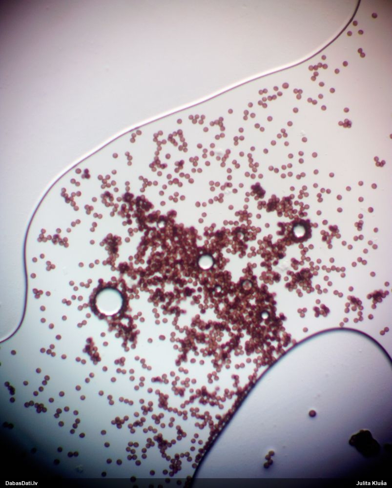 Un ja ir Badhamia, tad vajag arī uz stikliņa bez virsstikliņa mazos palielinājumos (lai nesaslapina okulāru) paskatīties, vai sporas negrupējas, pa divi vai vairāk. Te sporas izskatās ļoti apaļas, drīzāk negrupējas, bet paskatīties tāpat ir vērts.