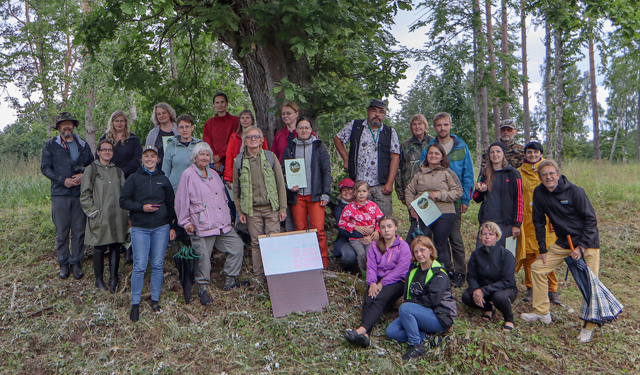 Rallija dalībnieki zem parkveida ozola pēc apbalvošanas.