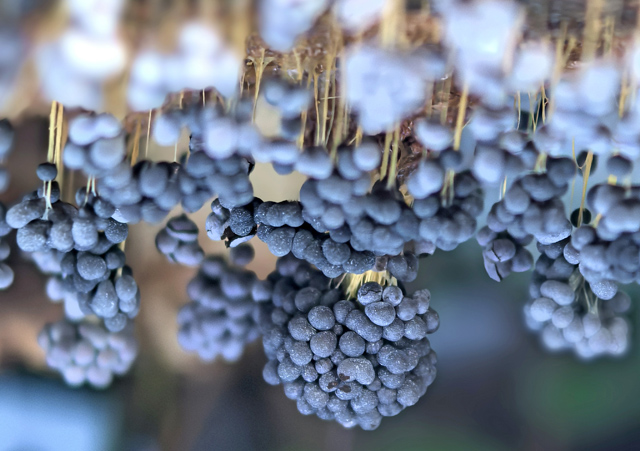 Uz pavasara pusi atrastās vīnogķekaru dzelksnītes, kas jau visas sporas (tās ir tumši brūnas) izbirdinājušas, atgādina striķīšos iekārtus saplīsušus baltus balonus.