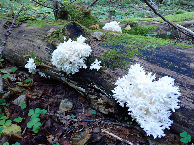 Koraļļu dižadatene Hericium coralloides – dabisko meža biotopu specifiskā suga un īpaši aizsargājama suga uz apses kritalas biotopā Veci vai dabiski boreāli meži. Foto: Ilze Ķuze