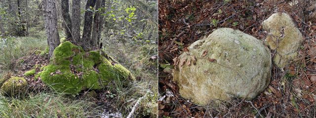 Dabisko meža biotopu indikatorsuga zilganā baltsamtīte Leucobryum glaucum. Pa kreisi – vitāls cinis biotopā Staignāju meži. Pa labi – apdeguši baltsamtītes ciņi nocirstā biotopā Staignāju meži. Foto: Ilze Ķuze