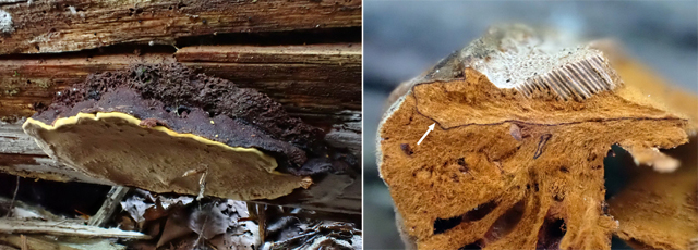 Melnsvītras cietpiepe Phellopilus nigrolimitatus – dabisko meža biotopu specifiskā suga un īpaši aizsargājama suga, kuras aizsardzībai var veidot mikroliegumu. Nereti paslēpjas egļu kritalu apakšējā daļā, tādēļ var būt grūti ieraugāma. Noteikšanas pazīme – šķērsgriezumā redzama melna svītra. Foto: Ilze Ķuze