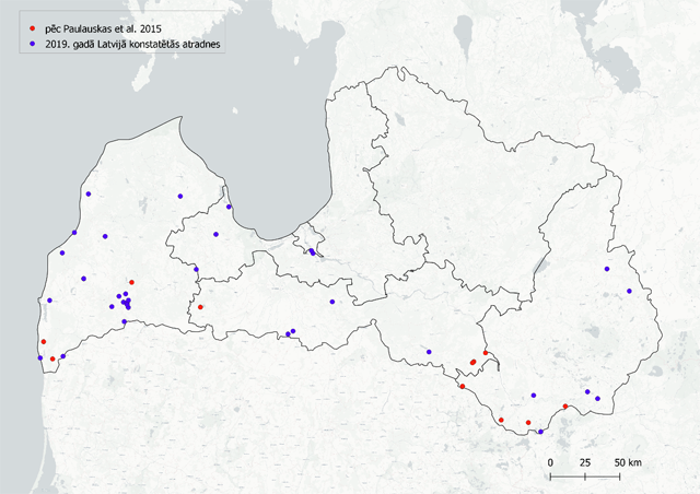 2. attēls. Ornamentētās pļavērces izplatība Latvijā (D. Pūle). Sarkanie punkti – 2013.-2014. g. atradnes (pēc Paulauskas et al. 2015), zilie punkti – 2016.-2019. g. atradnes).