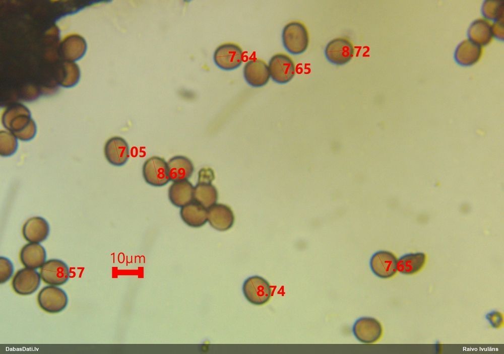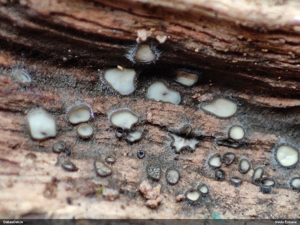 Nevar saprast, uz kā auga - vai tas ir nobirās, vai uz kritalas mizas? Abas hipotēzes ir "pa tēmu", bet man "nepatīk" kopskats, kur skaidri redzams, ka vairāki augļķermeņi ir cieši kopā, bet tas nav raksturīgs ne vienai, ne otrai hipotēzei, kur augļķermeņi tipiski ir nodalīti. Ļoti interesanti, ja ir paraugs, tad kāds tas izskatās tagad, un vispār to vajadzētu mikroskopēt.