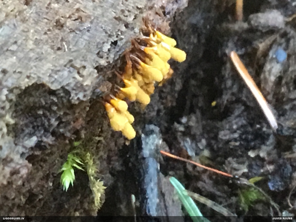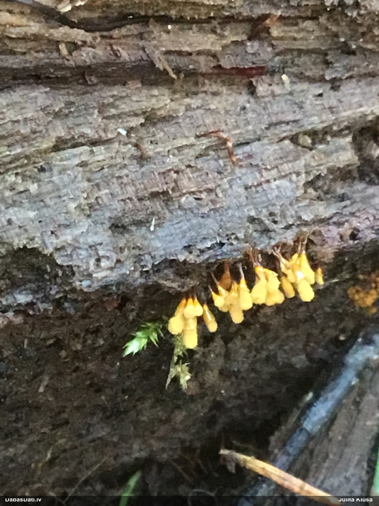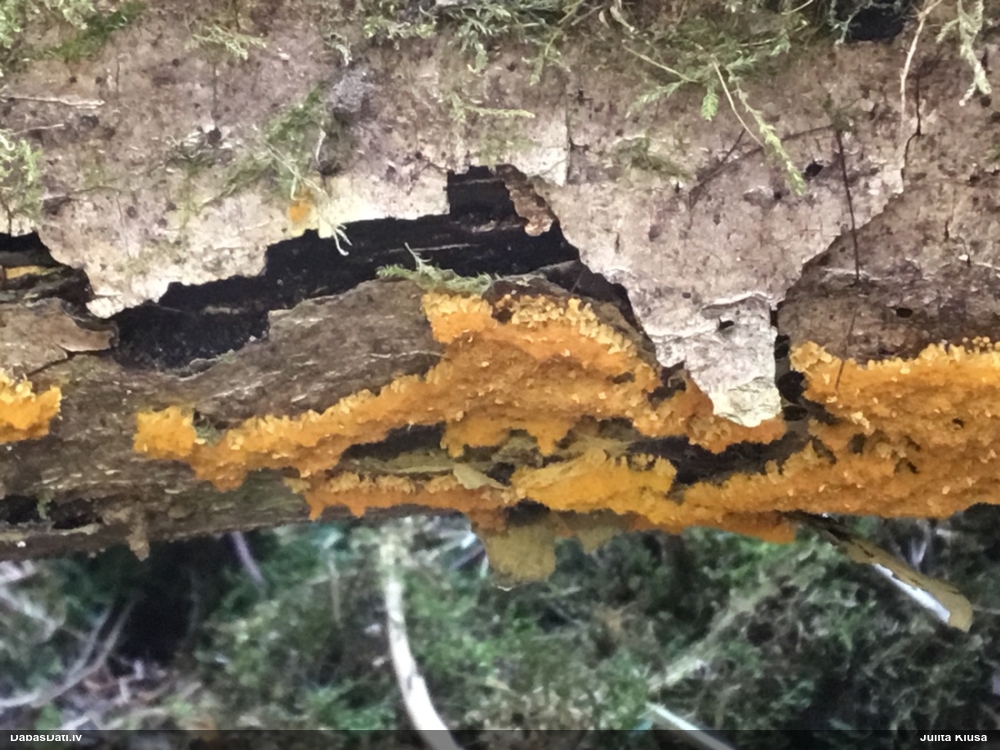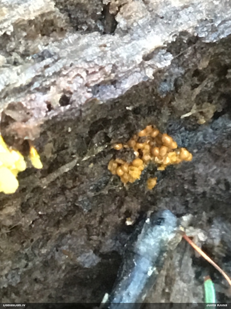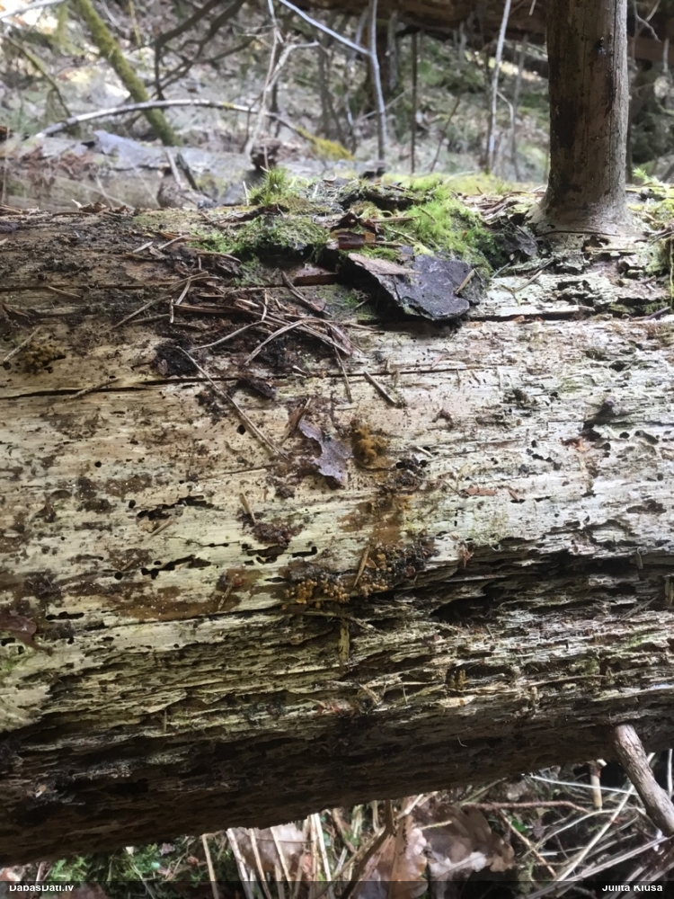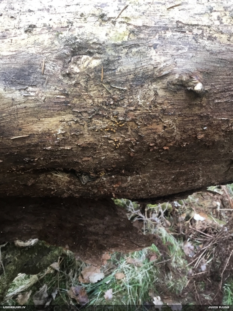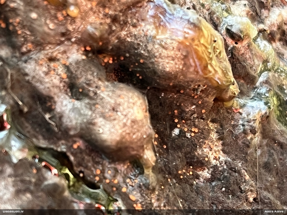 Jā, būtu jauki, ņemot vērā, ka nu jau skaidrāk iezīmējas, uz kā meklēt, un manējais atradums nemaz nebija vēl riktīgi izsporojies, lai arī nobriedis, tā ka arī domāju, ka noteikti cerības vēl ir. Pat šķita, ka manā gadījumā bija arī jaunāki eksemplāri, bet tad atkal sašaubījos, vai tie nav caurspīdīgi-baltgani sveķu pilieni. Ja ir pa vienam gab., tad pārliecība dabā nepavisam nav liela. Varbūt svarīgākais ir ne egles dzīvīgums, bet micēlijs, kas radies uz sveķiem, kas, savukārt, rodas no dzīvām eglēm. Tādā gadījumā drošs fakts ir tikai tas, ka eglei ir jābūt bijušai dzīvai :D. Līdzīgi esmu atradusi arī zeltpūšļu pilienīti Hemitrichia sordivesiculosa, kas raksturīgi aug uz dzīviem lapukokiem, bet es to atradu uz nesen lūzušas apses kritalas. "Dzīva vai nesen dzīva" - varbūt tā var saukt to vajadzīgo statusu.